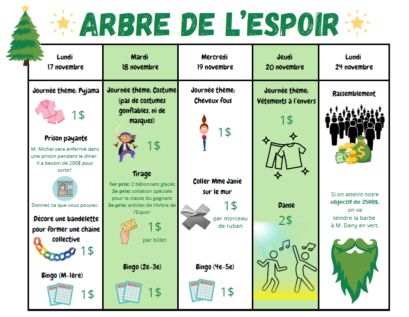 ExpiréVoici les activités planifiées pour la levée de fonds de l’Arbre de l’espoir.